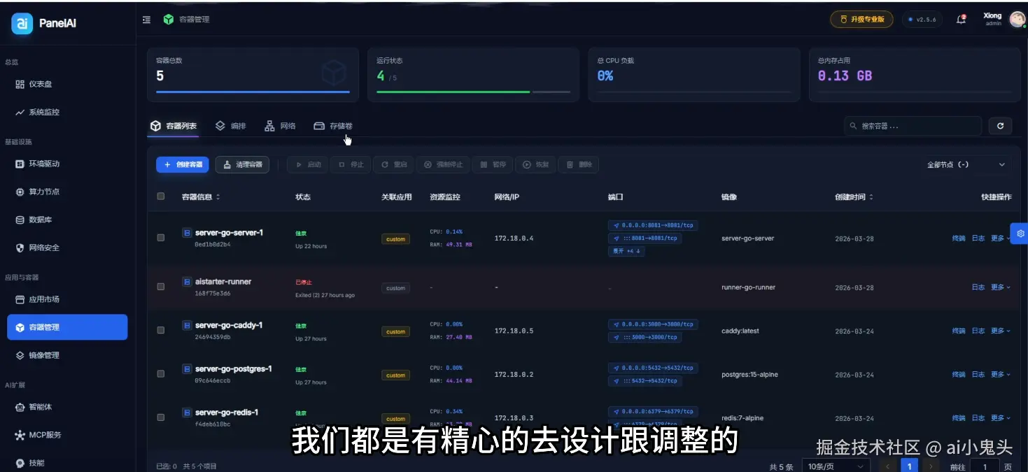 - 容器管理:清晰展示每个子服务器上的容器实例,支持名称、健康状态、关联应用、端口映射等信息。一键展开端口、查看终端、日志;