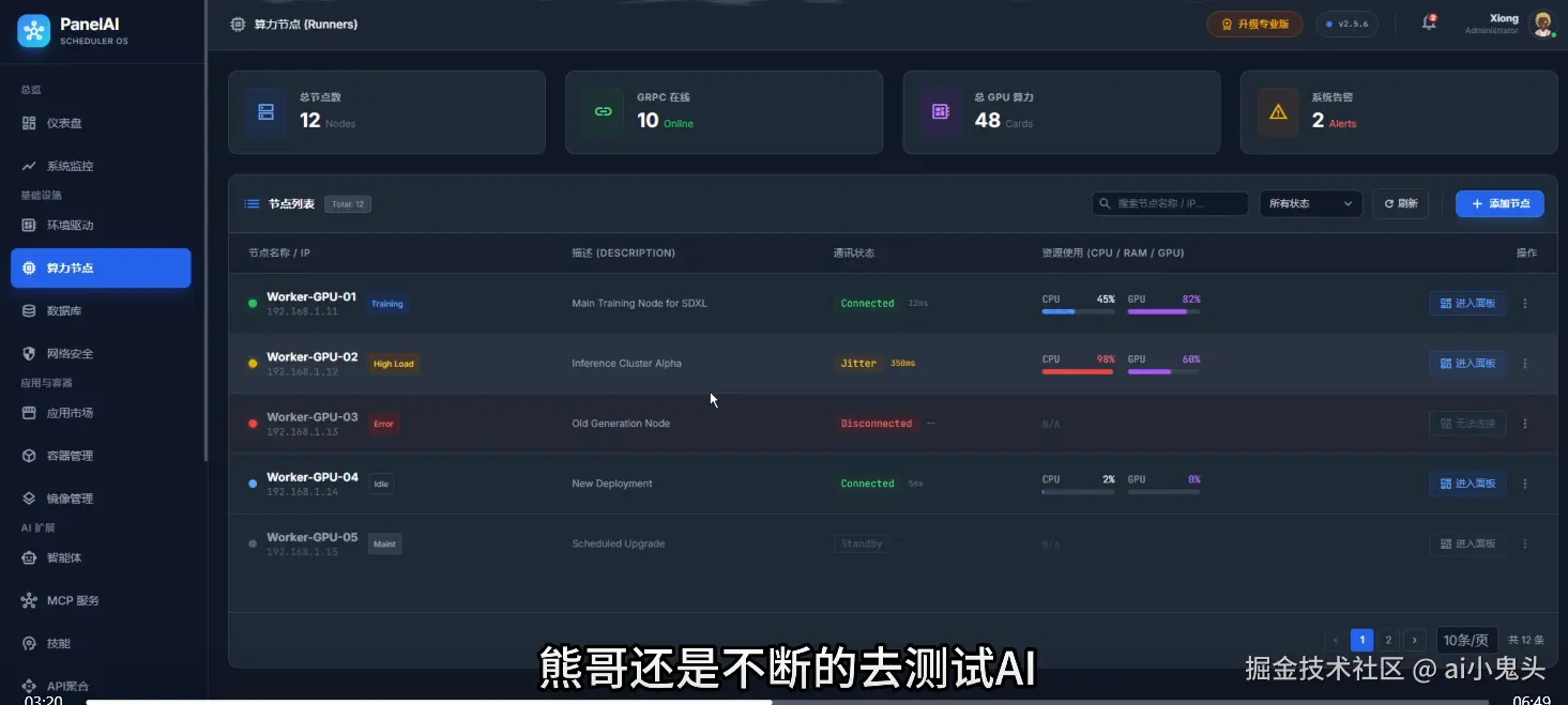 算力节点管理:多节点列表实时查看,支持筛选、进入子服务器面板,实现真正的总调度管理子服务集群;