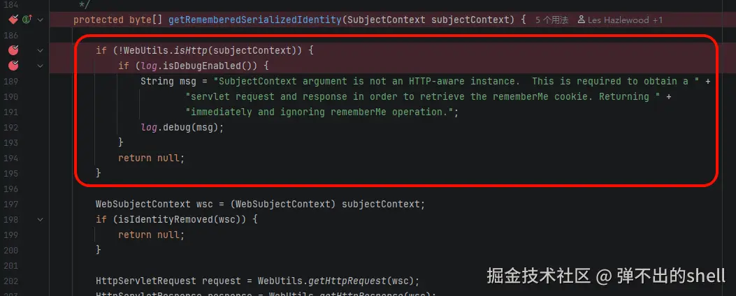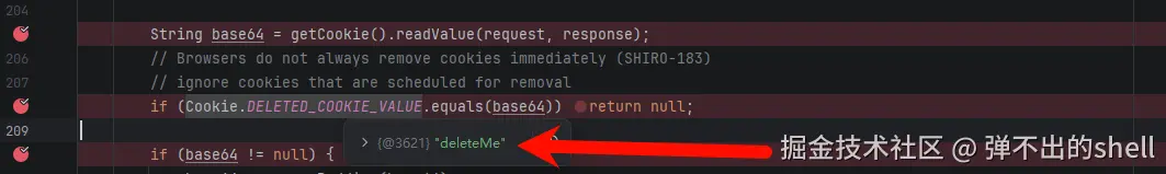 接下来就是从 HTTP 请求里读取 rememberMe cookie 的值,如果值是 deleteMe 就忽略,这是之前已经标记删除的 cookie: