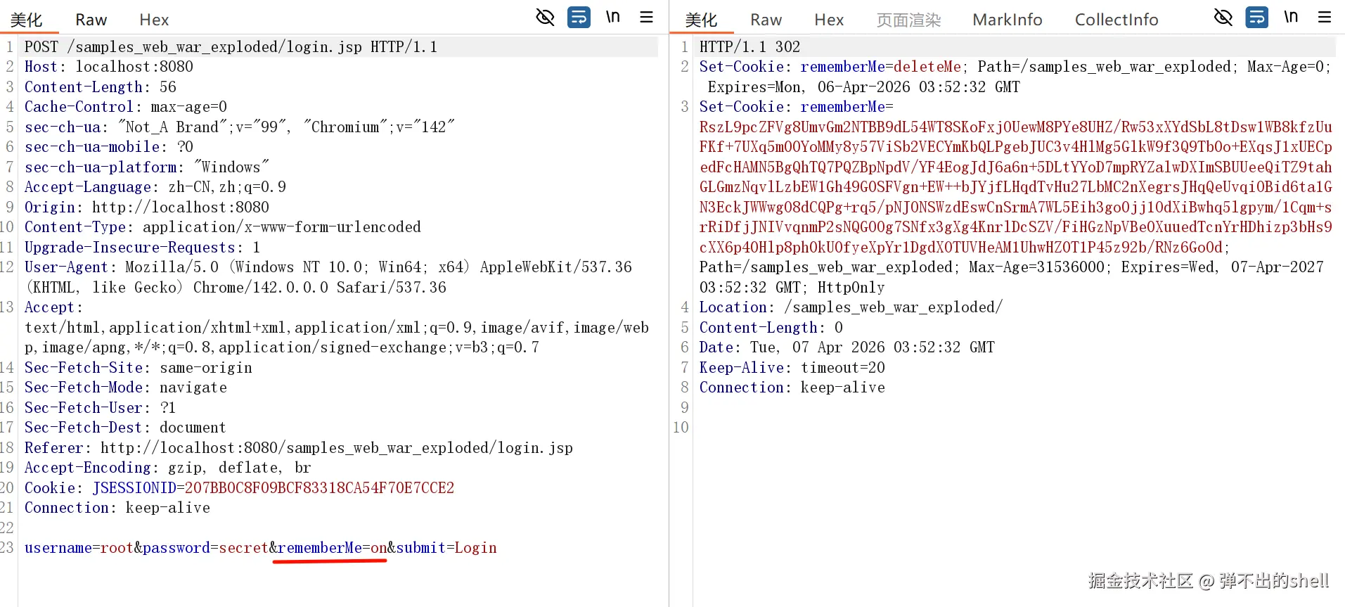 区别在于发包时有没有 rememberMe=on 参数(Cookie 里的值才是重点)。
