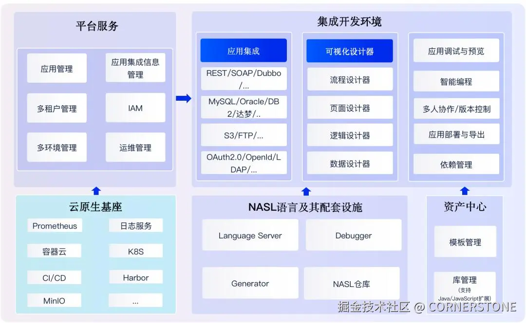 - 第四层,集成与连接器层。API管理、第三方系统对接。你的低代码应用,可以和SAP、用友、金蝶无缝集成。