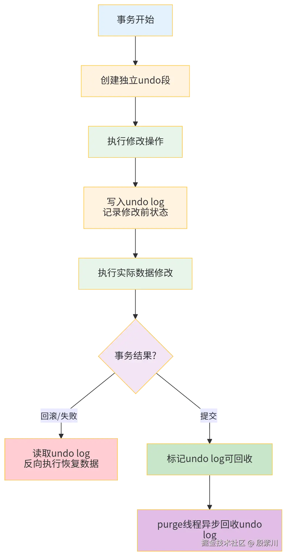 事务提交后,undo log 不会立即删除(因为可能被MVCC用于读取历史版本),而是标记为“可回收”,后台的purge线程会定期扫描,将已过期(没有事务再需要读取该版本)的undo log 回收,释放存储空间。