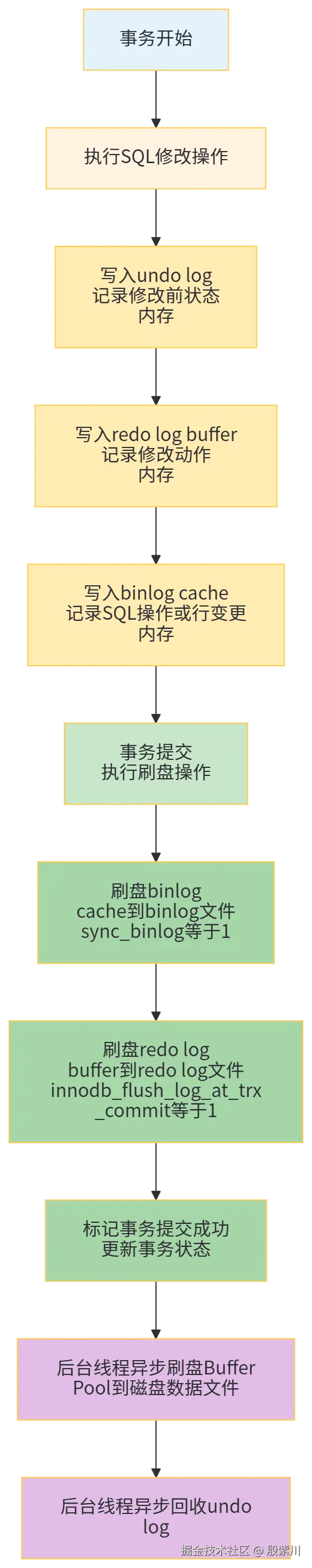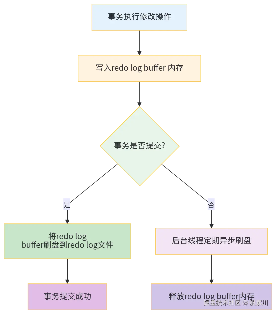 事务提交时,InnoDB 会将 redo log buffer 中的内容刷到磁盘(redo log 文件),这一步是保证事务持久性的关键。这里要注意:事务提交的“成功”,是以 redo log 刷盘完成为准,而非数据刷盘完成——只要 redo log 刷盘成功,就算数据还在缓冲池、未写入磁盘,后续MySQL宕机,也能通过 redo log 恢复数据。