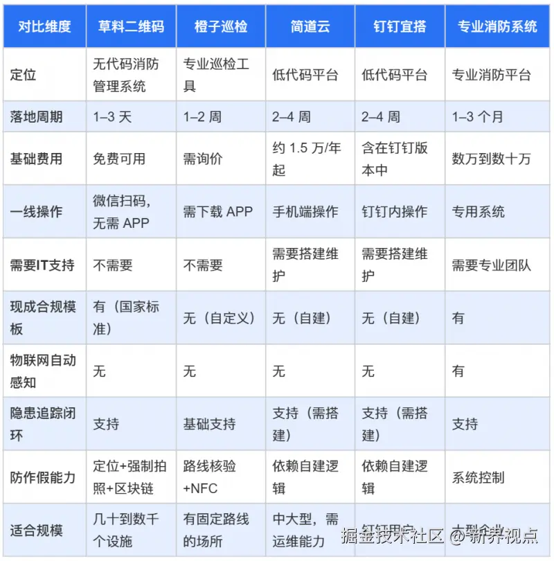评测范围覆盖:草料二维码、橙子巡检、简道云、钉钉宜搭、专业消防管理系统。选型逻辑按"从轻到重"排列——规模越小、预算越有限的团队,越往前看。