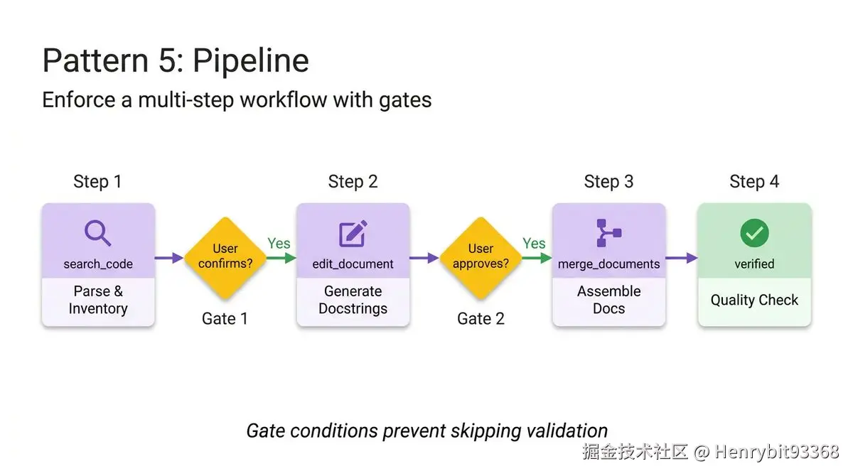 五个“设计规范”至此形成完整体系:Tool Wrapper 管单点规范,Generator 管结构生成,Reviewer 管质量评判,Inversion 管需求澄清,Pipeline 管复杂流程编排——覆盖了 AI Agent 在实际工程场景中面临的所有典型任务形态。