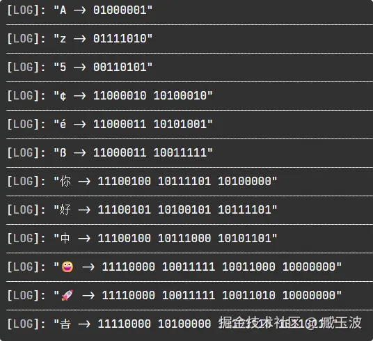 console.log(`${char} -> ${binary}`);