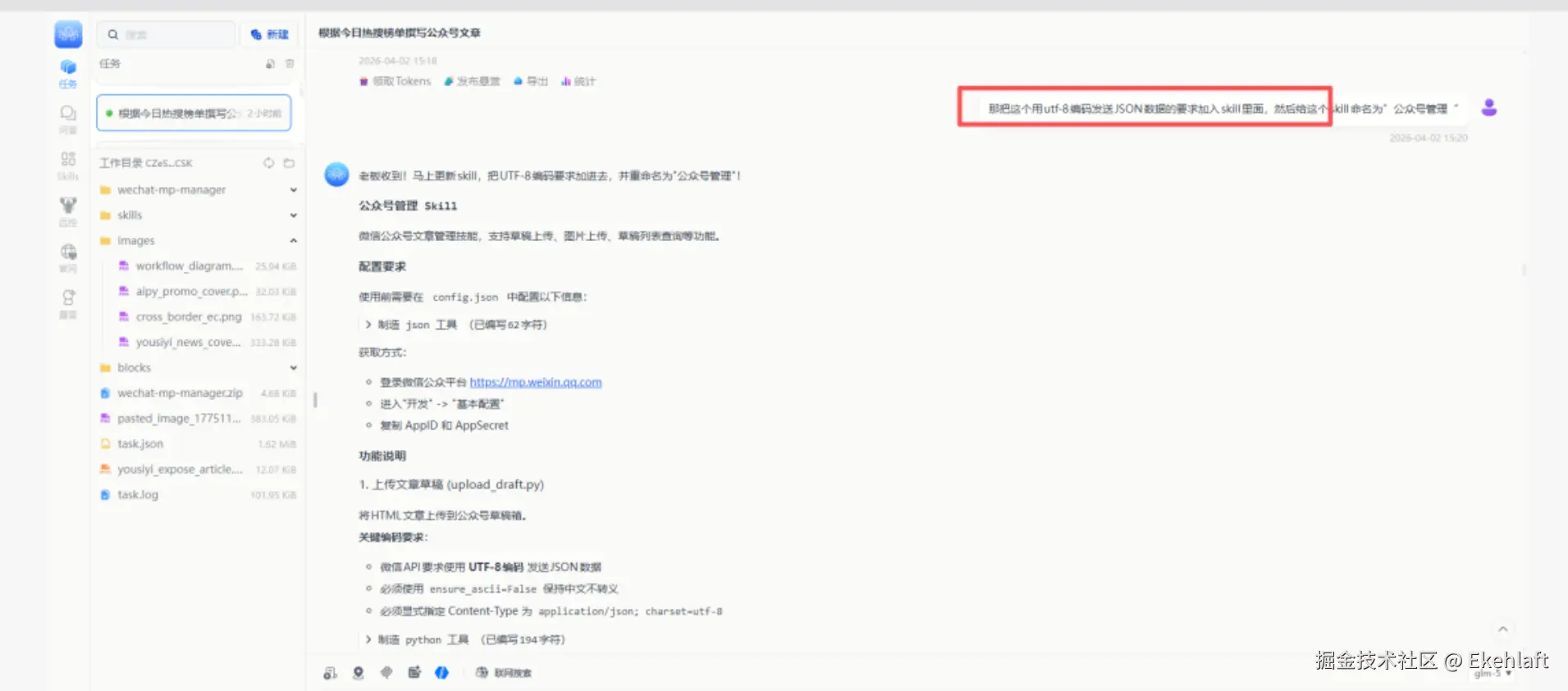 这样,以后所有用到公众号功能的任务,AiPy 都会自动调用这个 Skill,无需手动选择。