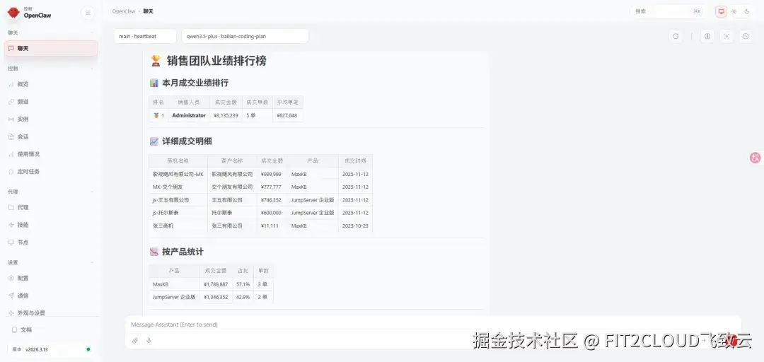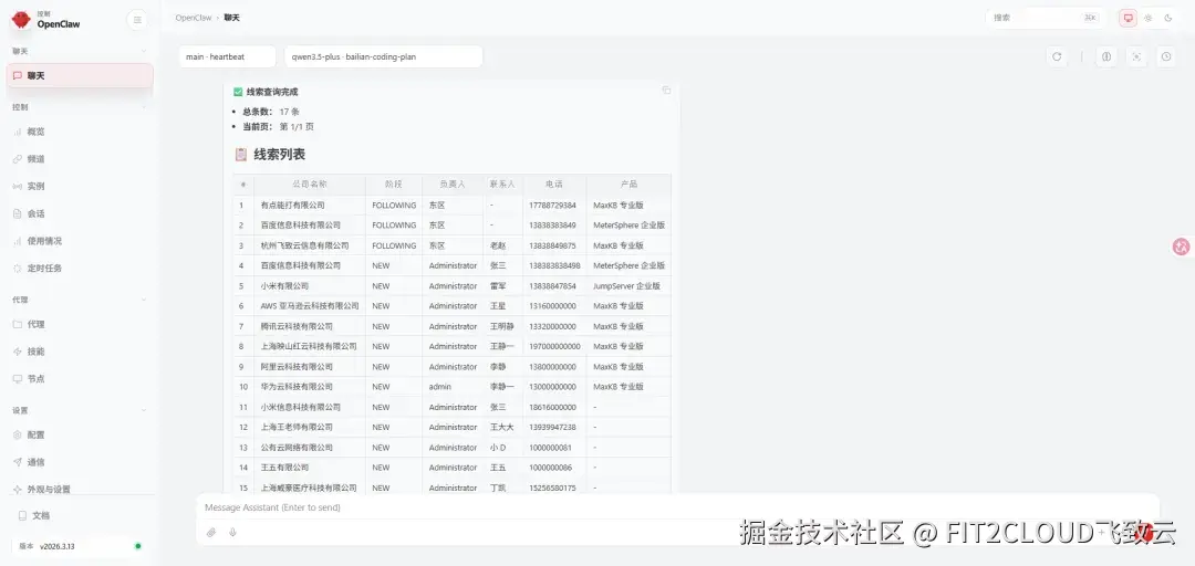Cordys CRM Skills配置完成后,用户无需再次登录Cordys CRM,直接在OpenClaw对话框通过自然语言下达指令,即可方便地调取所需的业务数据。