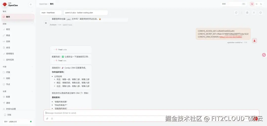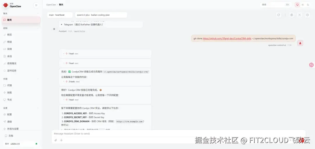 Cordys CRM Skills的部署过程极其简便,支持手动配置或通过AI自动化引导完成。以下是以OpenClaw为例的安装、配置与测试流程示例: