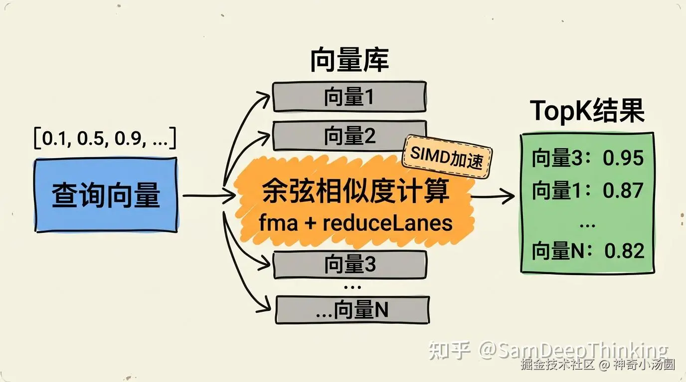 AI应用中最常见的一个需求:给定一个查询向量,在一批候选向量中找出最相似的TopK个。推荐系统、RAG检索、以图搜图,底层都是这个计算。Lucene和Elasticsearch的向量搜索功能,内部也在用Vector API加速这类运算。