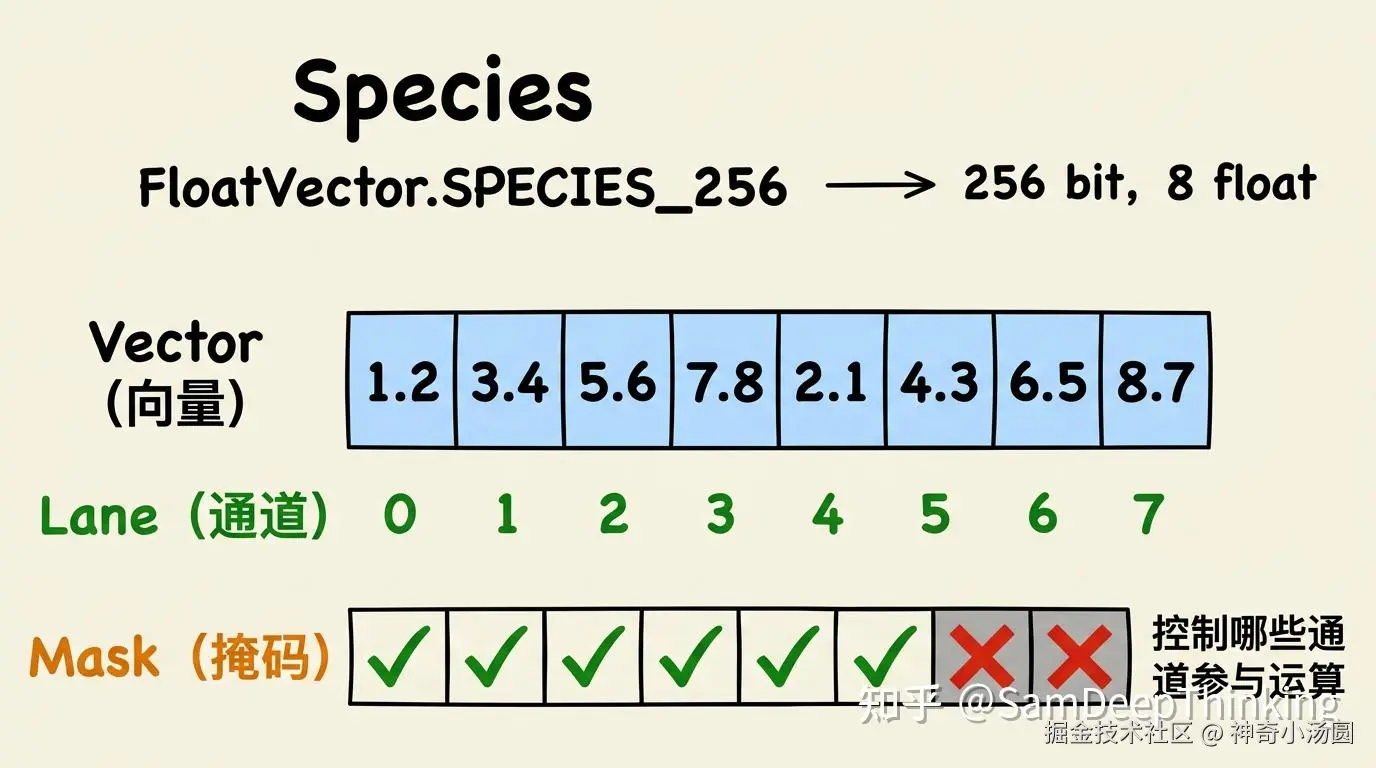 Species定义了一个向量的两个属性:元素类型和向量位宽。FloatVector.SPECIES_256表示一个256位宽的float向量,能装8个float(每个float占32位,256÷32=8)。DoubleVector.SPECIES_256表示一个256位宽的double向量,能装4个double(每个double占64位,256÷64=4)。