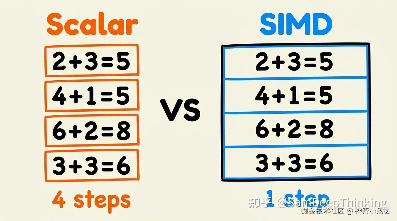传统的标量计算方式,4个浮点数相加需要4条加法指令,CPU依次执行。SIMD方式下,CPU用一条指令就能同时完成4个(甚至8个、16个)浮点数的加法。