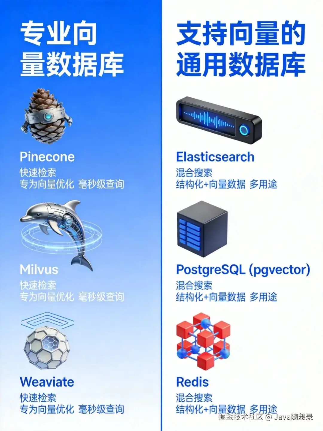 - 集成向量检索功能的通用数据库:传统关系型或文档型数据库,通过插件或内置功能支持向量检索。代表产品有Elasticsearch(dense_vector字段)、PostgreSQL(pgvector插件)、Redis。优势是同时处理结构化数据和向量数据,适合混合检索场景。