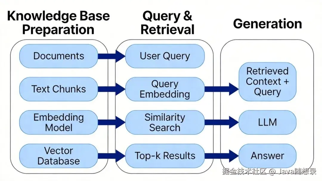 - 查询与检索:用户提问时,系统把查询语句转换为查询向量。在向量数据库中通过余弦相似度计算,找出最相似的top-k个文本块。这是语义检索,不是关键词匹配。