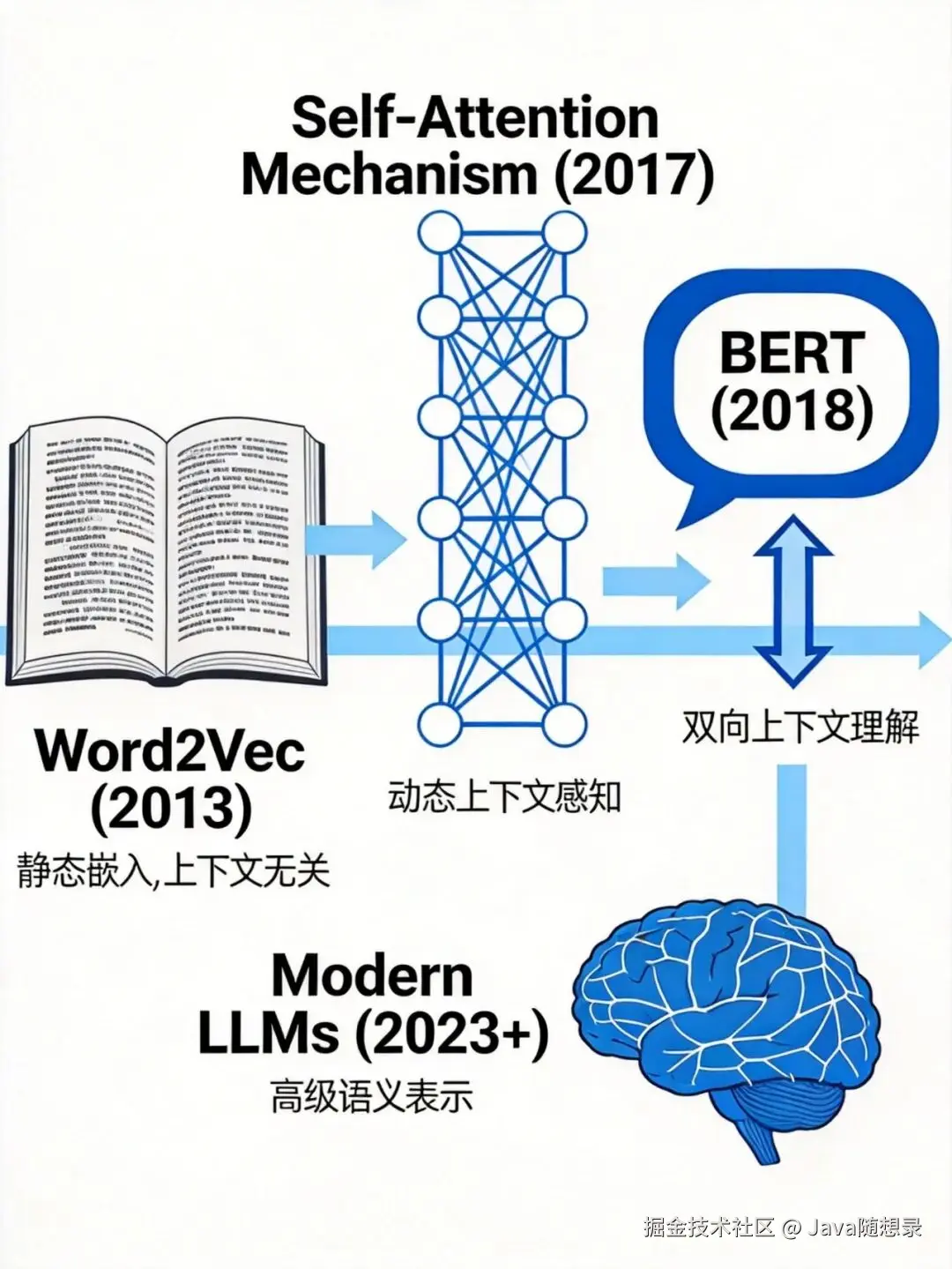 从技术演进看,Embedding从简单的词向量发展到上下文感知的动态表示。从Word2Vec到BERT,再到如今的大语言模型,每次技术突破都伴随着Embedding能力提升。