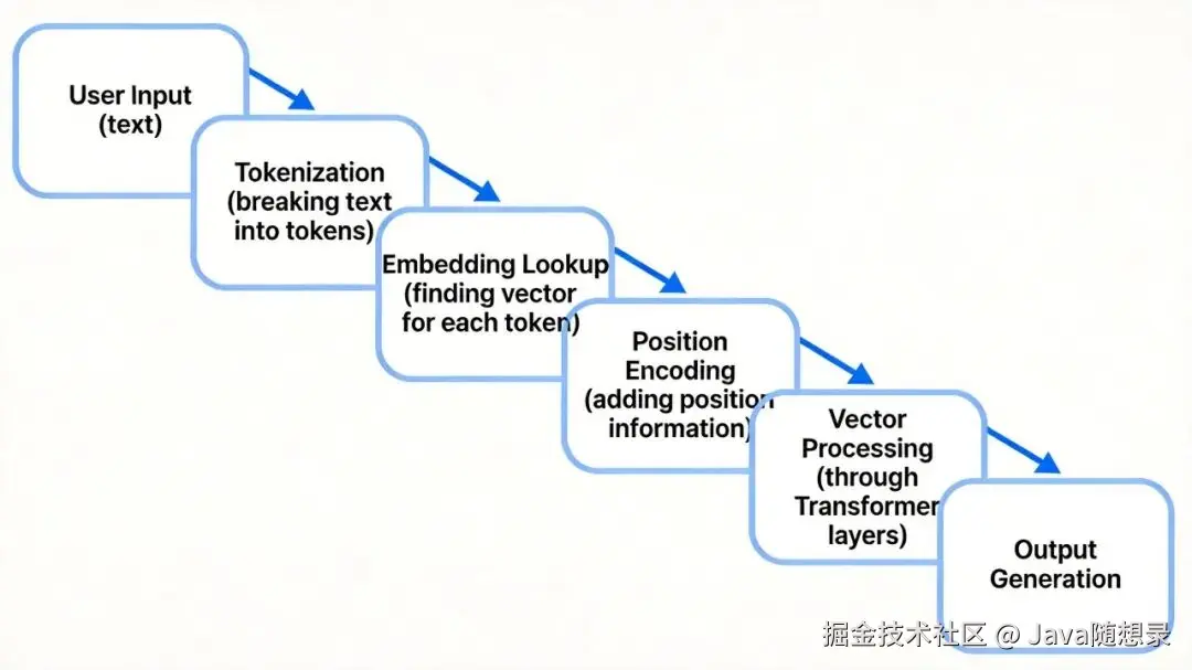 - 第二步:Embedding Lookup(向量查询):每个token有唯一ID。LLM内部维护巨大Embedding矩阵,类似字典。模型看到token ID,在矩阵中查找对应向量。