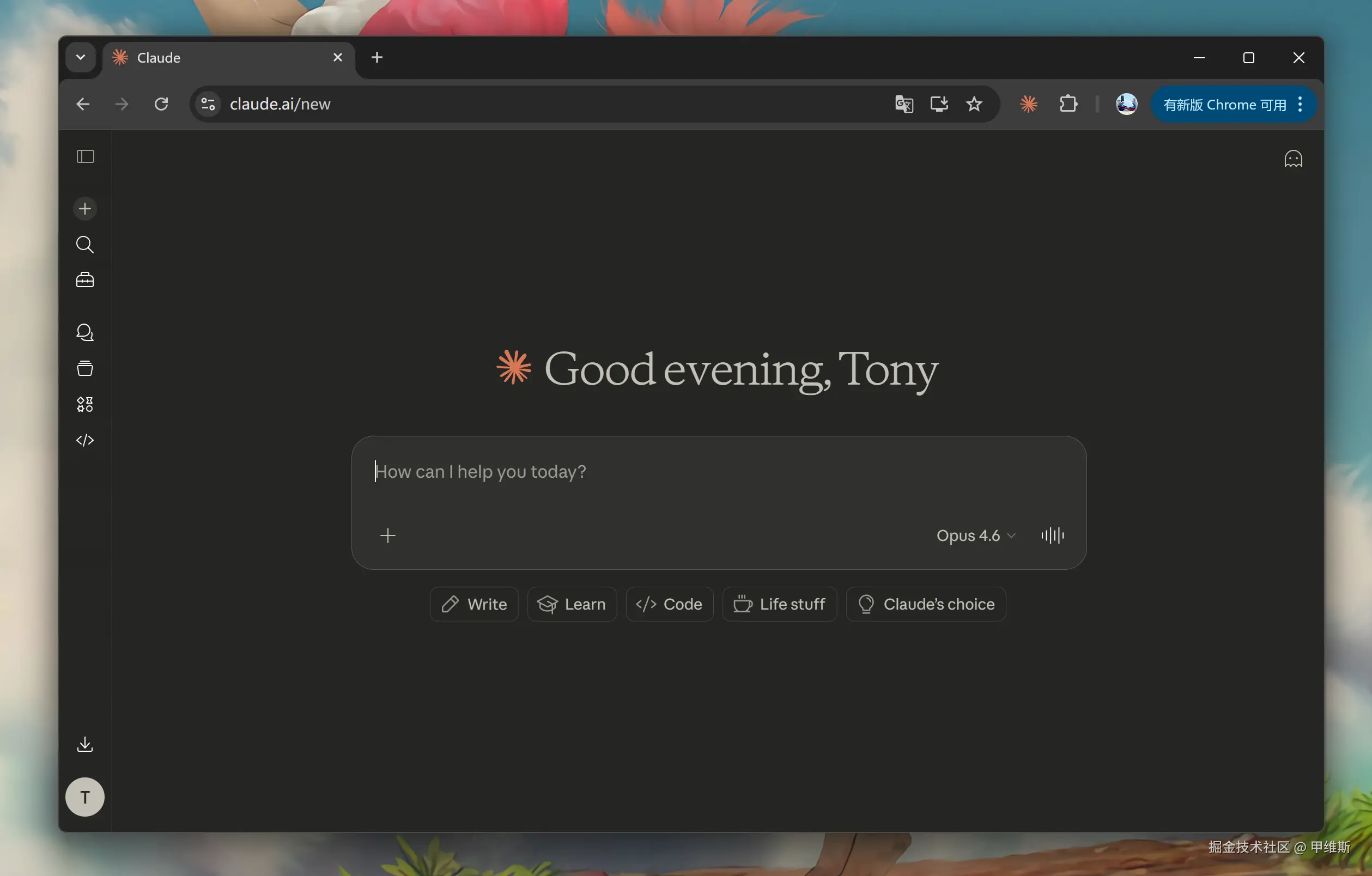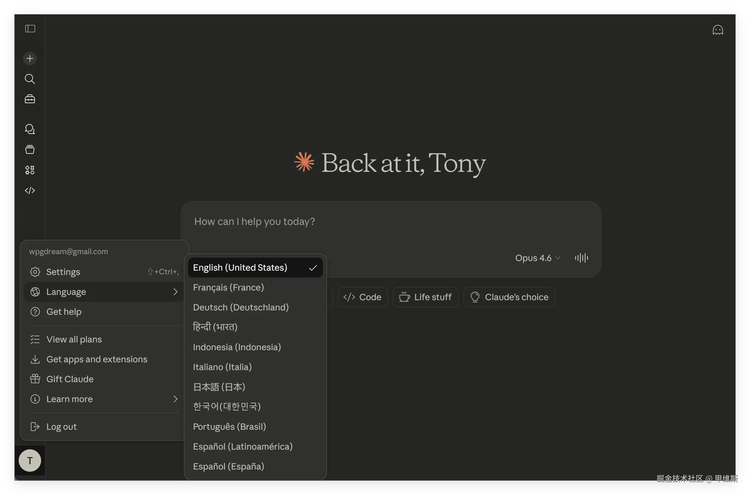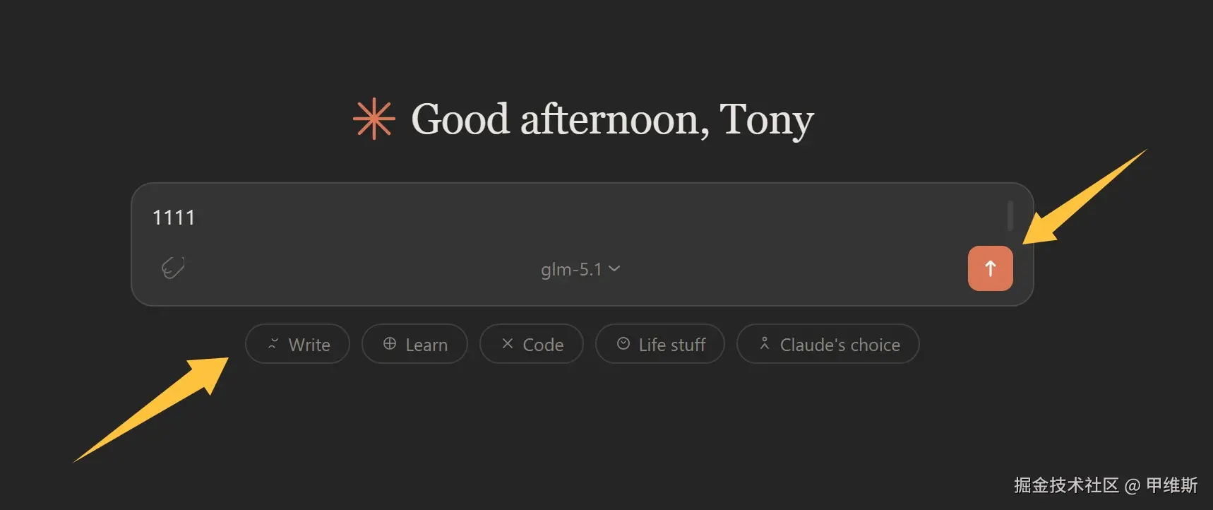 Claude 的网页设置非常细致。输入框中没有内容,右下角是音频输入图标。一旦输入文字,就会切换并点亮发送图标。这个也是一个很好的考点。