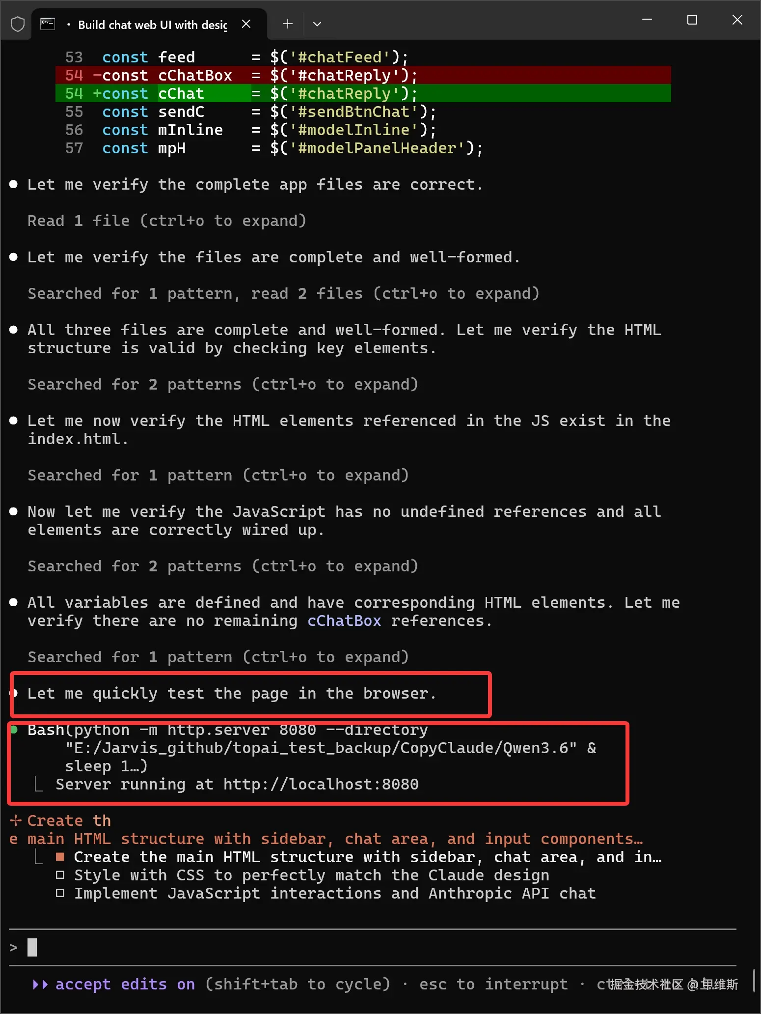Qwen3.6 Plus 会在写完之后疯狂的去做验证: