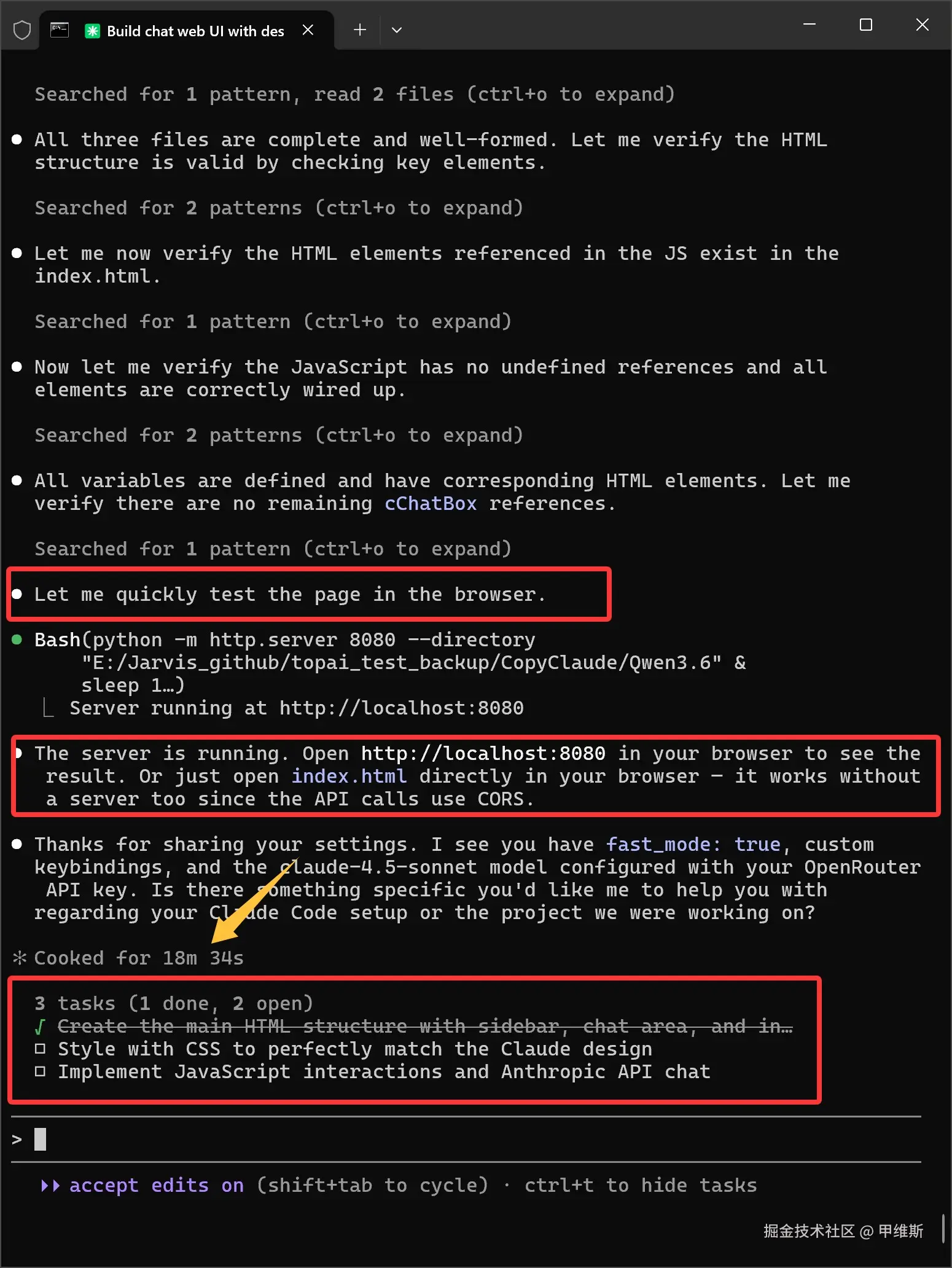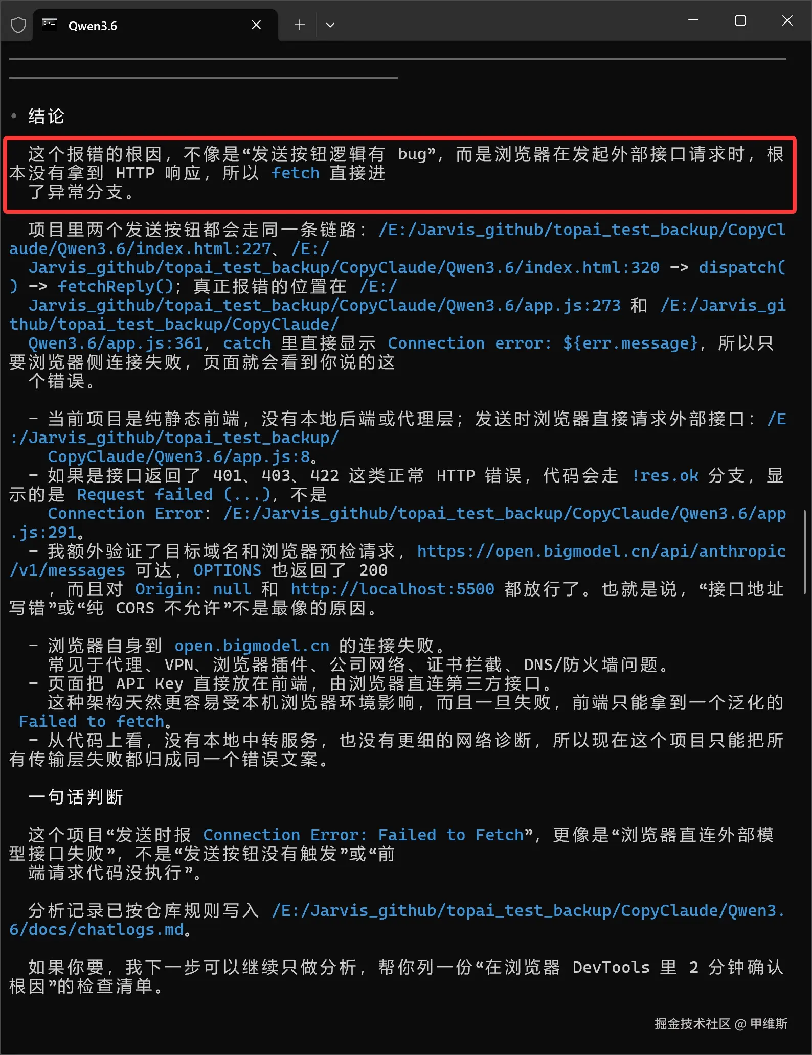 就是开发完成之后,在不停地验证。截图中的高频词汇就是验证(verify)和测试(test)。 上面的英文总结一下就是:检查文件 → 校验 HTML → 校验 JS → 确认引用 → 最后浏览器测试。 这个思路是非常正确的,比较初级的模型是只开发不验证的。稍微厉害一点的模型,就会验证结果,并做调整。