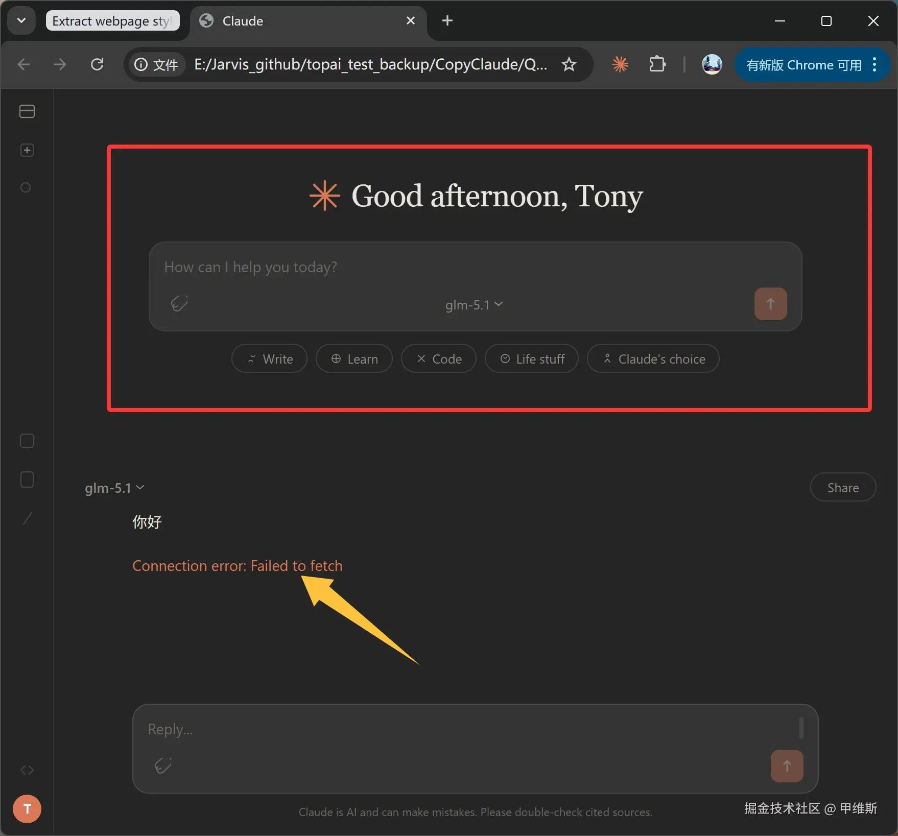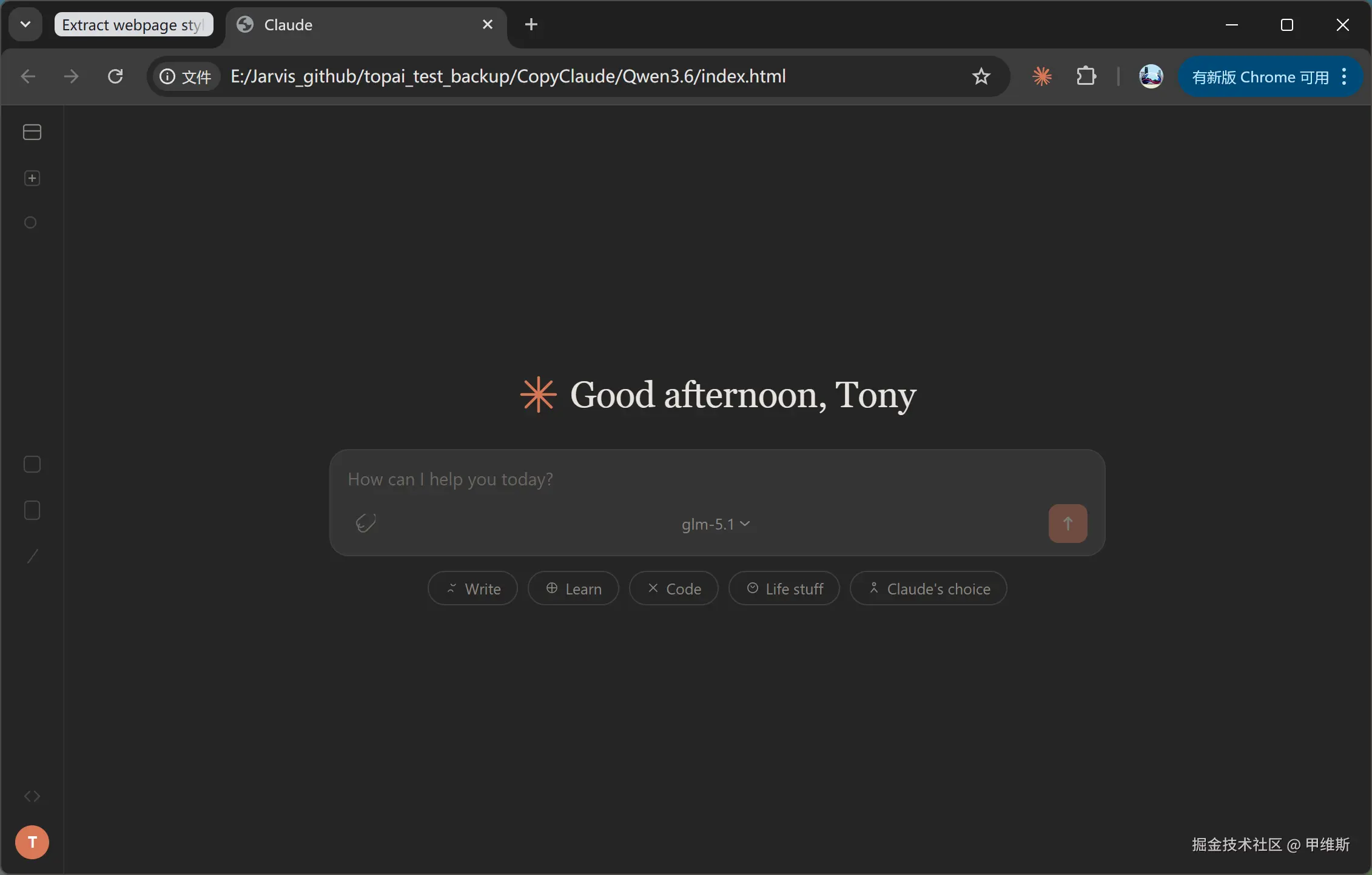也就是说,如果复刻比较成功的话,就相当于我拥有了一个 Claude AI 克隆版网站,可以选择模型,也可以展开左边的菜单,还可以发送内容,并收到反馈。