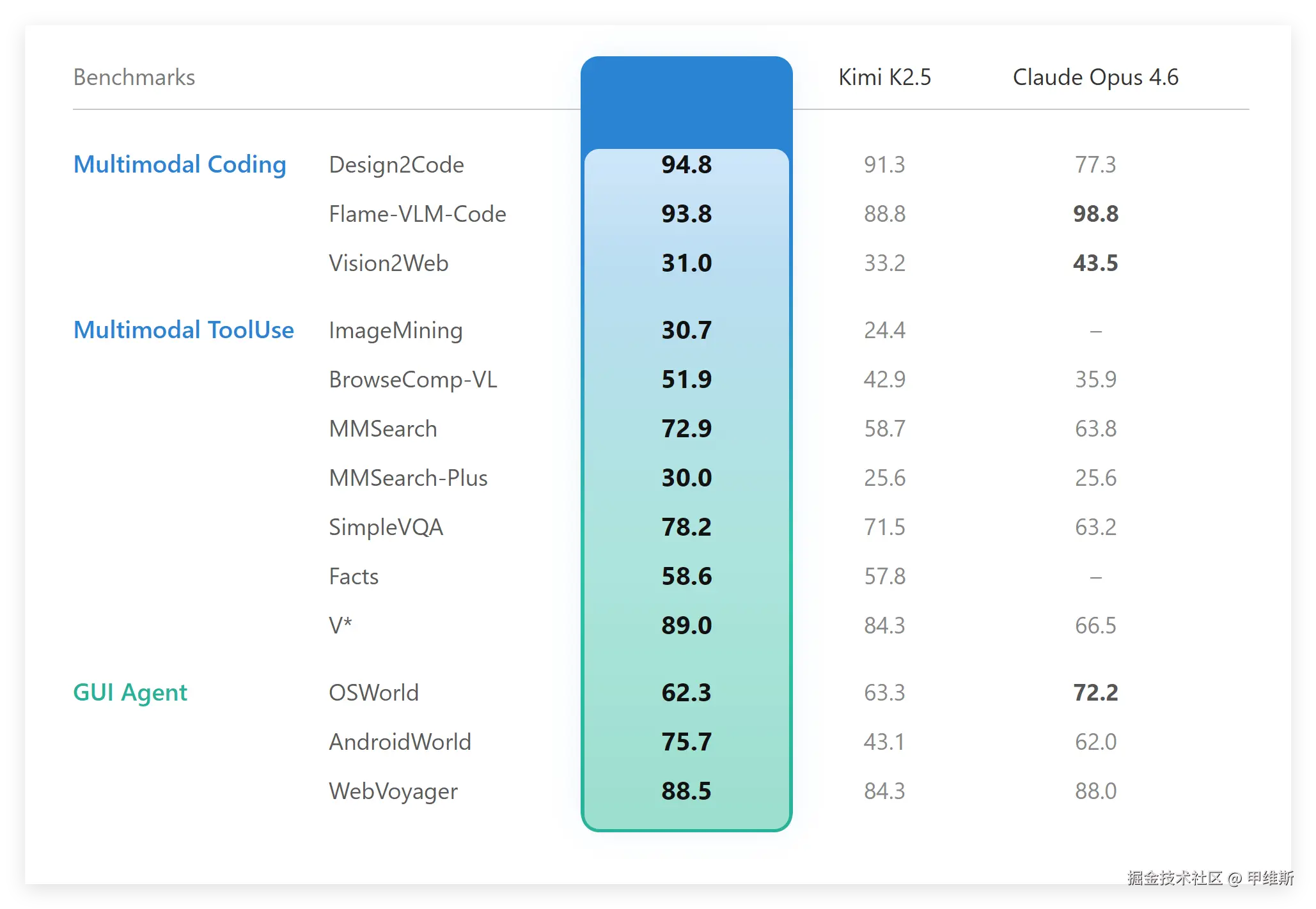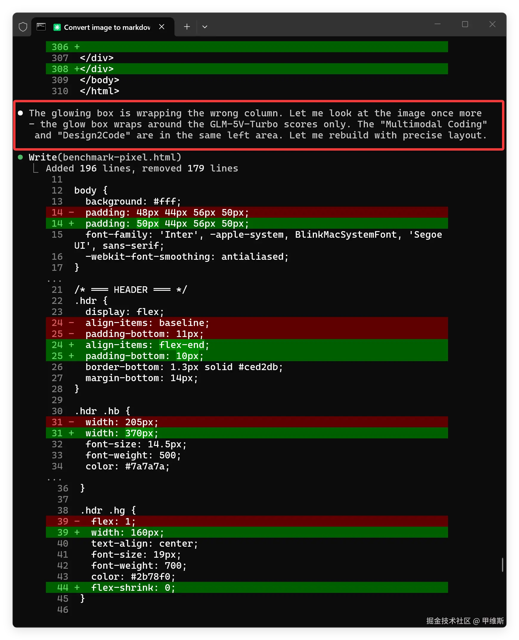 这个高亮框选中了错误的列。让我再看一眼图片—— 这个高亮框只包住了 GLM-5V-Turbo 的分数。 “Multimodal Coding”和“Design2Code”其实是在左侧同一块区域。 我需要用更精确的布局重新构建一下。