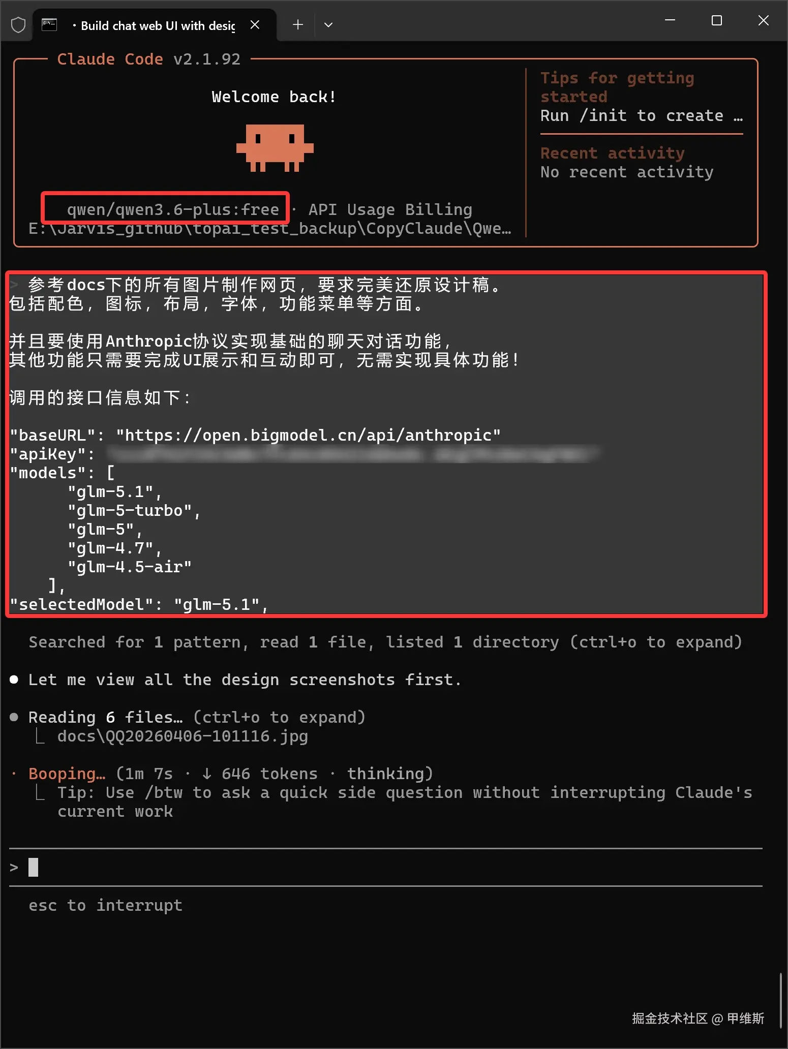 这样就会自动打开 Claude Code,并且定位到我们测试目录,同时会自动注入环境变量,调用 qwen/qwen3.6-plus:free 这个模型。