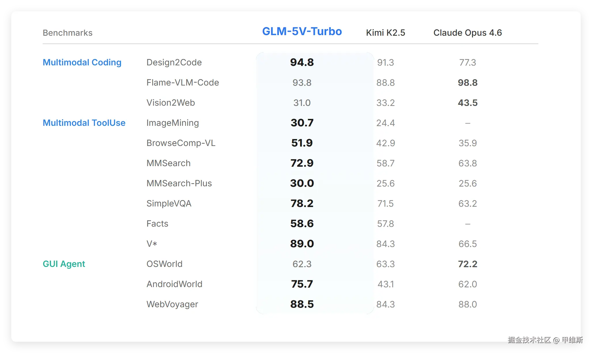 第一个上场的是官方基准全方位“超越” Opus 4.6 的 GLM-5V-Turbo。