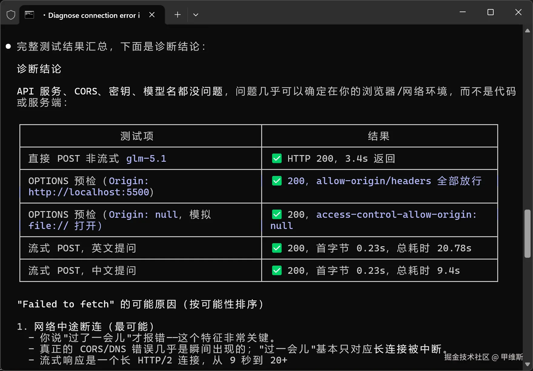 至于这个错误是为什么?我尝试过启动服务,再测试,也不行! 诡异的是 GPT5.4 和 Opus 4.6 都找不出问题。