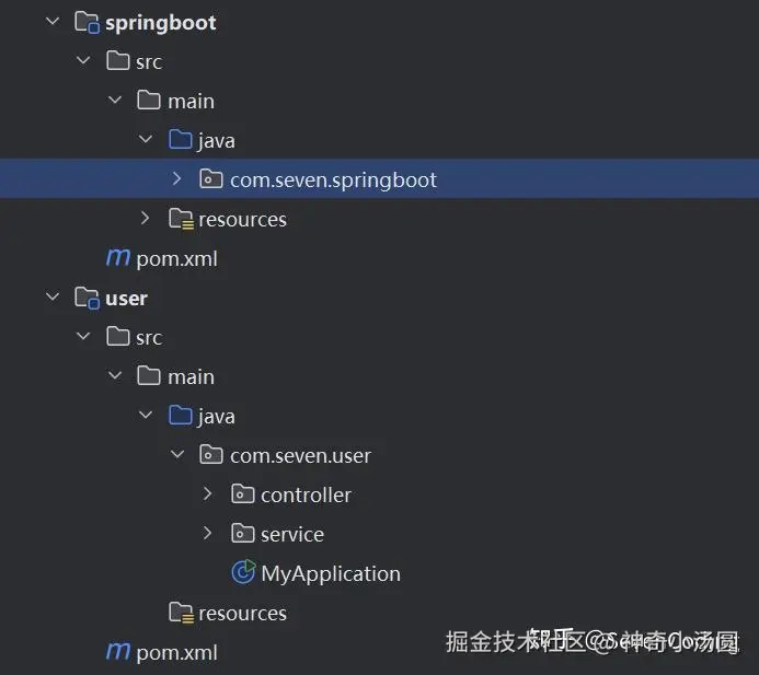 为了实现这个功能,以及为了最后的效果演示,我们需要把springboot源码和业务代码源码拆分两个maven模块,也就相当于两个项目,最后的源码结构为: