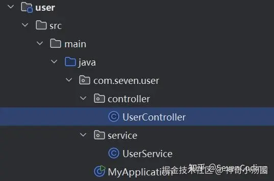 因为我们模拟实现的是SpringBoot,而不是SpringMVC,所以我直接在user包下定义了UserController和UserService,最终我们希望能运行MyApplication中的main方法,就直接启动了项目,并能在浏览器中正常的访问到UserController中的某个方法。