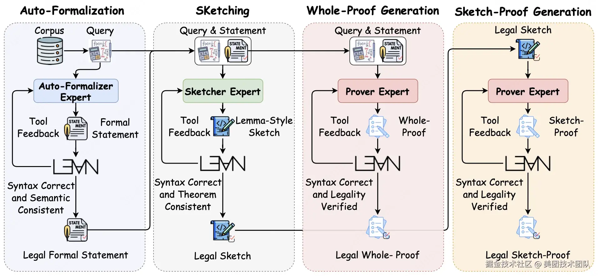 1. 自动形式化(Auto-Formalization)——“翻译题目”:先将自然语言描述的数学问题,精准翻译成 Lean4 计算机能看懂的形式化描述。
