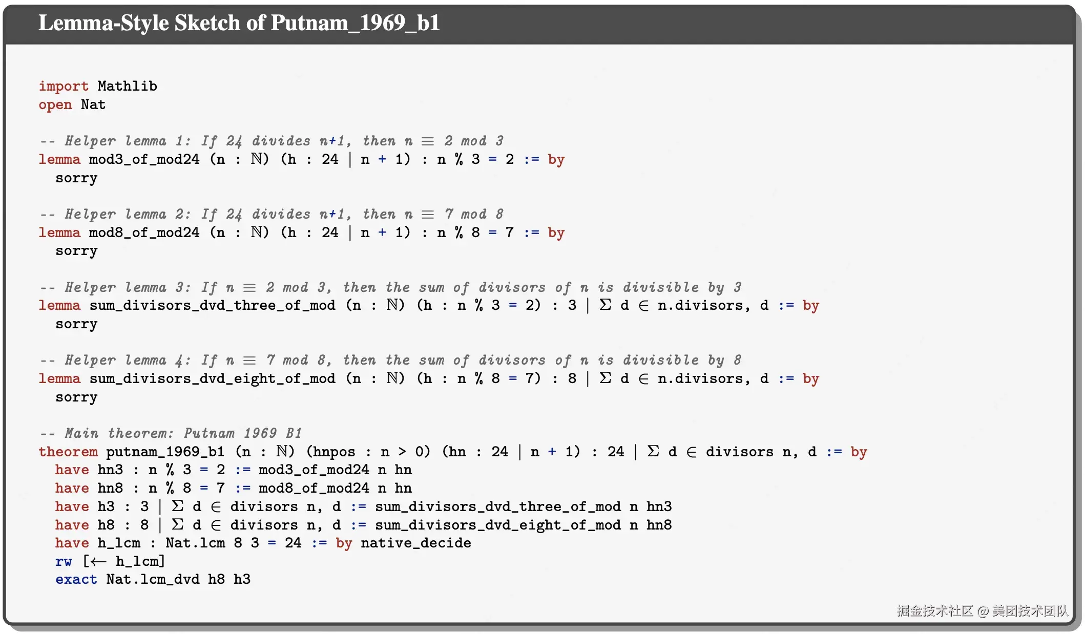 2. 草稿生成(Sketching)——“写解题大纲”:面对复杂定理,不急于一步写完。模型会先写一个草稿,把大问题拆解成几个需要证明的小引理(Lemma),理清逻辑主线。