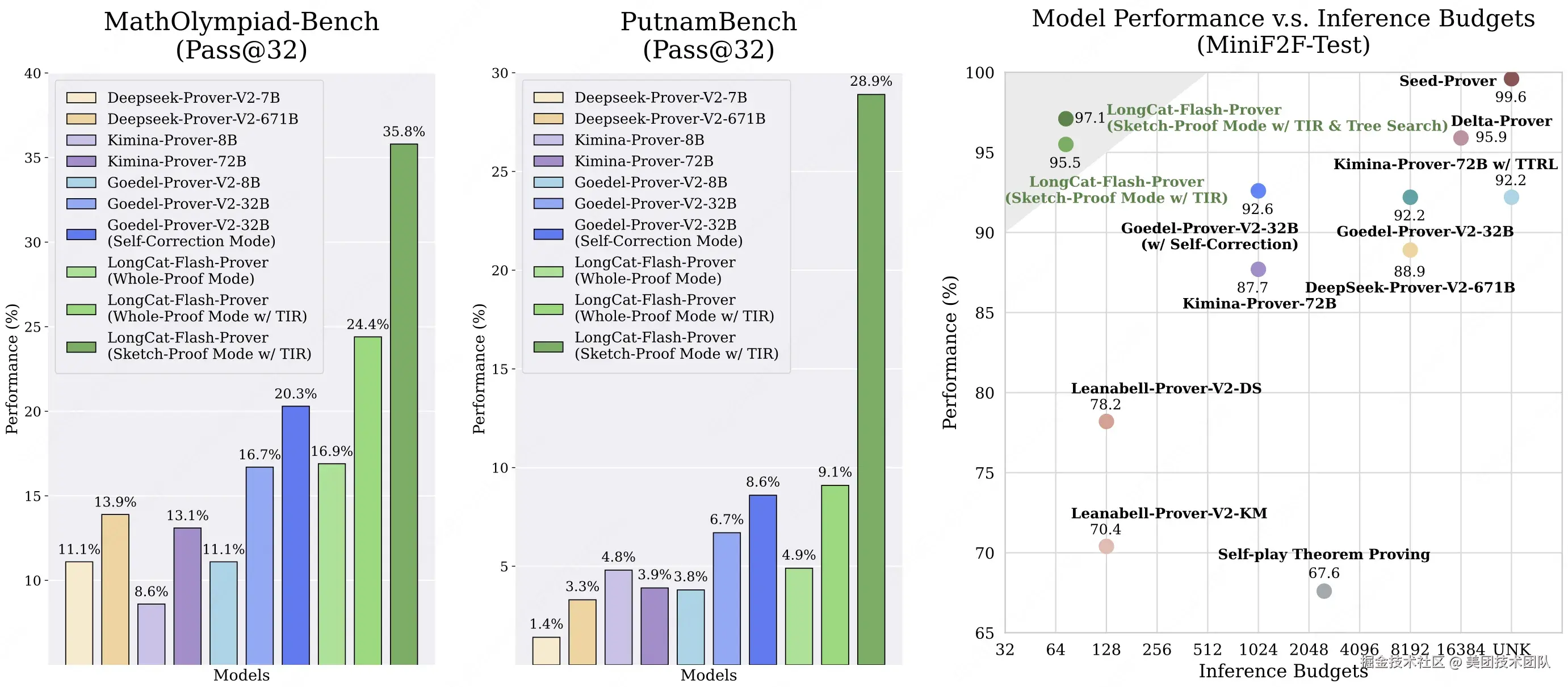 LongCat-Flash-Prover 在解决定理证明和形式化任务时,将形式化推理拆解为自动形式化(Auto-Formalization)、草稿生成(Sketching)和证明生成(Proving)三大原子能力。在结合工具集成推理(Tool-Integrated Reasoning,TIR)策略下,仅用 72 次推理预算,MiniF2F-Test 通过率就达到 97.1%,在已知开源 Prover 模型中刷新 SOTA;在超难竞赛级任务上,MathOlympiad-Bench 达 46.7%(180 次预算),PutnamBench 达 41.5%(118 次预算),同样超越现有开源模型。