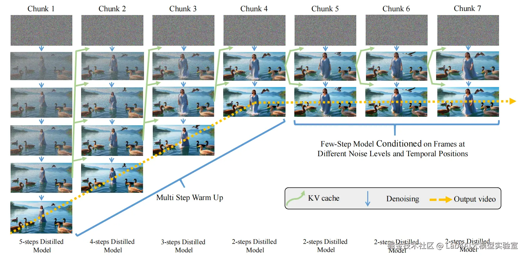 - 对角降噪:逐片段渐进减少降噪步,前3个片段分别用5/4/3步,后续片段固定2步;复用前序片段最终噪声帧的KV缓存,降低冗余计算。