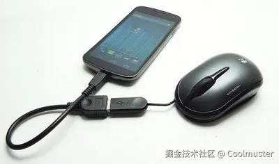 第一步:使用 USB OTG 数据线将 USB 鼠标连接到小米手机。将鼠标插入 OTG 数据线的 USB 端口。