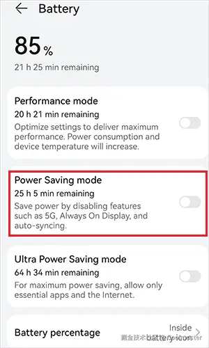 步骤 1. 进入“设置”>“电池”,关闭“省电模式”。