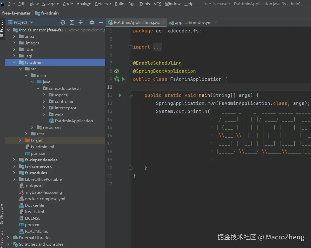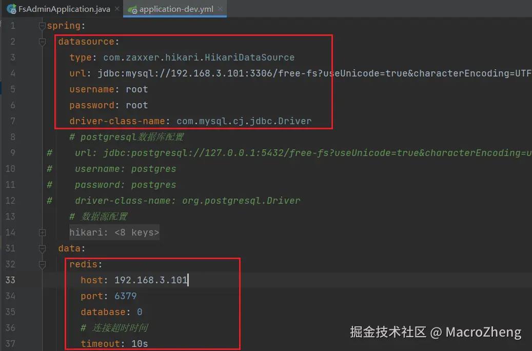 fs-admin模块下的配置文件application-dev.yml,将其中的mysql和redis连接配置修改成自己的;