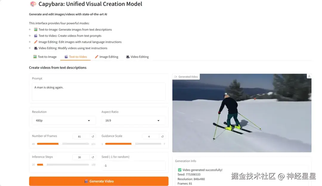 Capybara 是由 xgen-universe 团队于 2026 年 2 月发布的一个统一视觉创作模型,旨在完成各种视觉创作任务,包括文本生成图像、文本生成视频、基于指令的图像编辑以及基于指令的视频编辑。Capybara 基于先进的扩散模型和 Transformer 架构构建,目标是提供一个统一且高效的视觉生成与编辑框架。