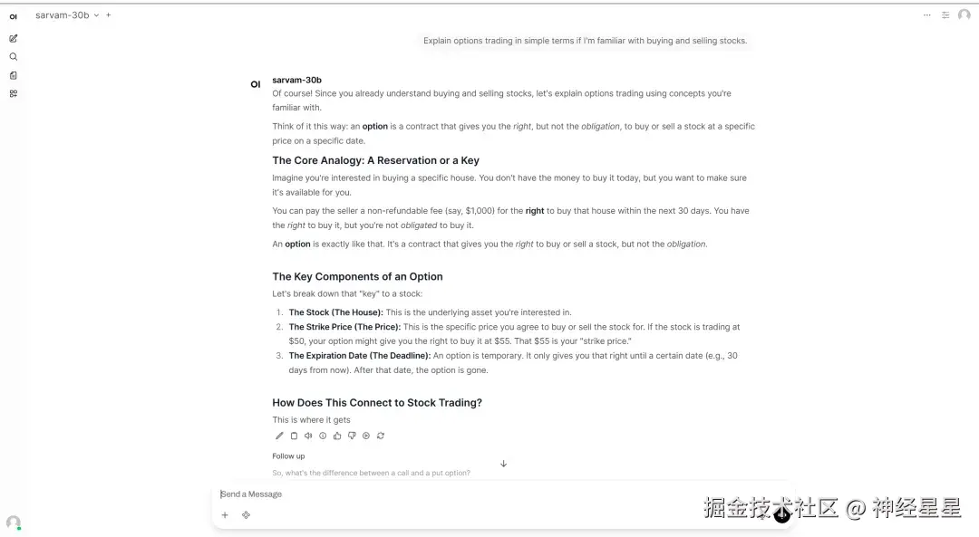 Sarvam-30B 是由 Sarvam AI 于 2026 年 3 月推出的开源大语言模型。作为 Sarvam 最新开源模型系列中的 30B 版本,它采用 Mixture-of-Experts(MoE)架构,总参数规模为 30B、每 token 激活参数约为 2.4B,面向多语言对话、推理、编码与实际部署场景进行了系统优化。