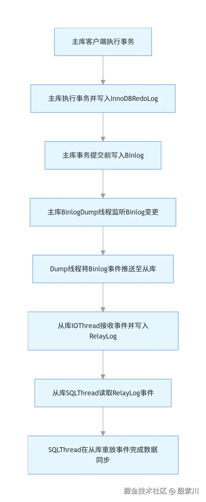 主从复制的完整数据流转链路共8个核心步骤,覆盖从主库事务提交到从库数据同步完成的全流程: