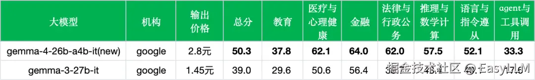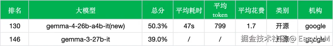 - 代际进步明显:从gemma-3-27b-it的39.0%到gemma-4-26b-a4b-it的50.3%,11.3个百分点的提升印证了Gemma 4系列整体架构升级的有效性。