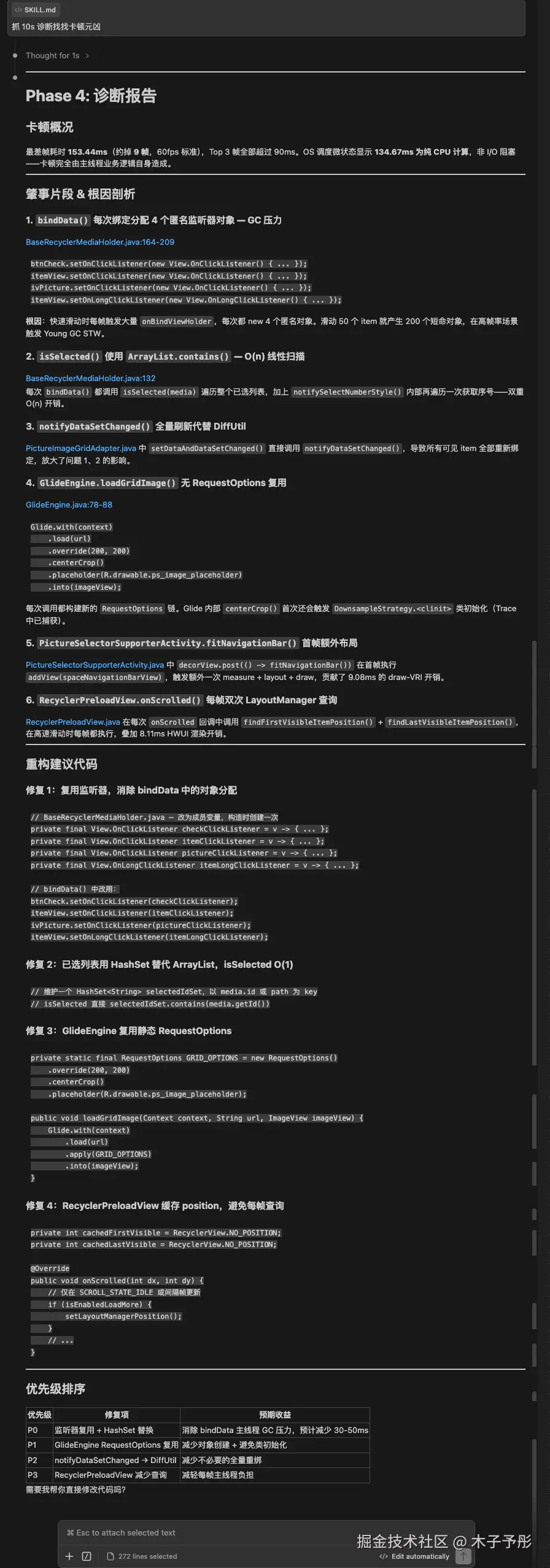 description: 当用户提出优化 Android 页面滑落卡顿、抓取底层 Trace 查找耗时点等诉求时自动被唤起。触发示例:帮我抓个 5s 的 Trace 看看滑动掉帧、抓 10s 诊断找找卡顿元凶。