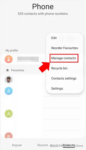 步骤 1: 转到发件人上的联系人应用程序,然后单击“菜单”图标。然后选择“管理联系人”。