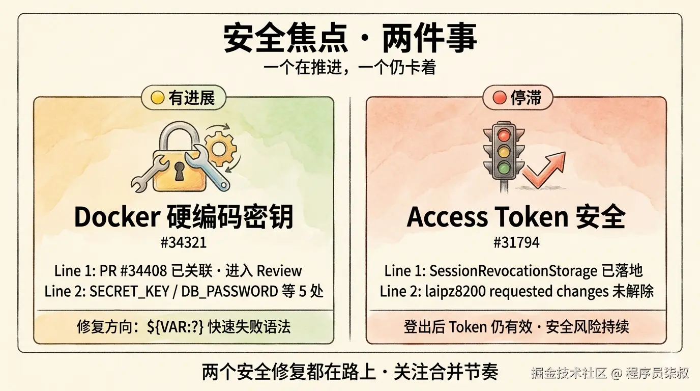 | 安全进展 | #34321 硬编码密钥 PR #34408 关联;#31794 仍待 laipz8200 解锁 |