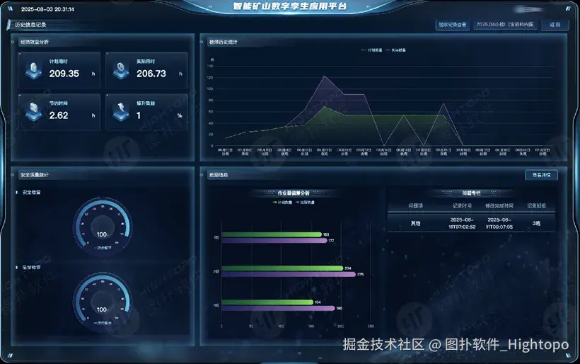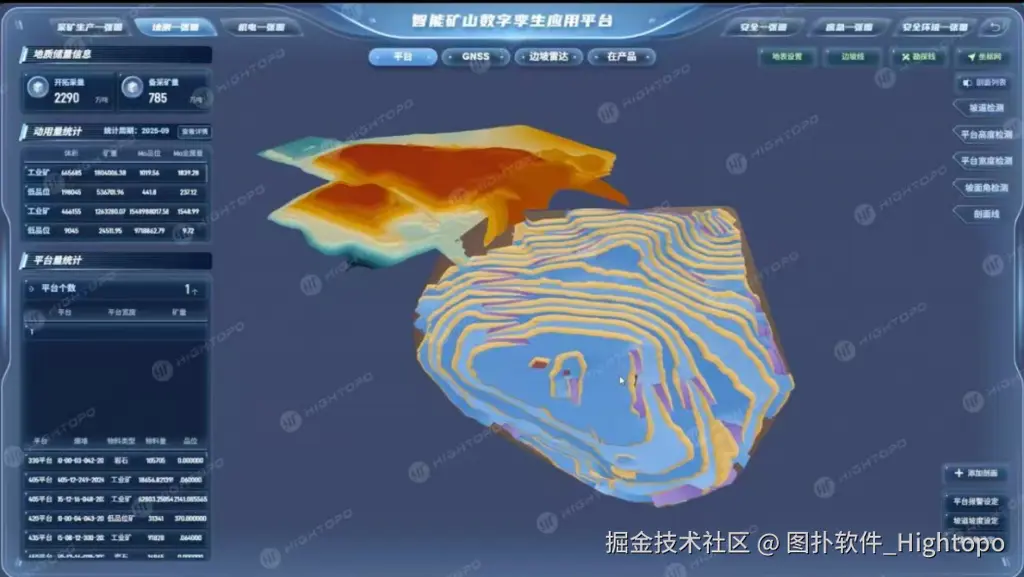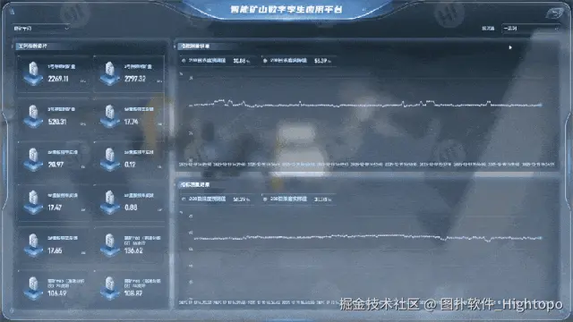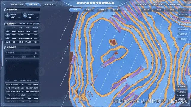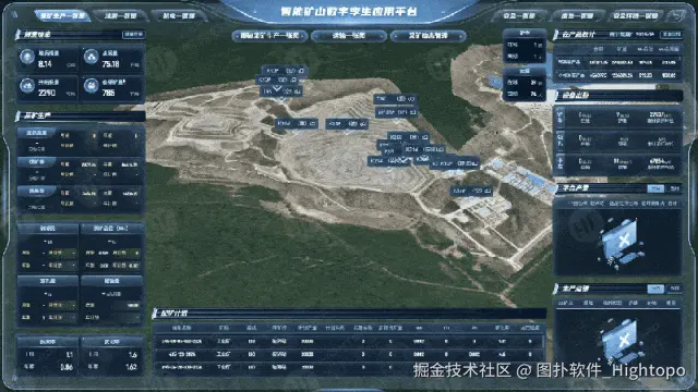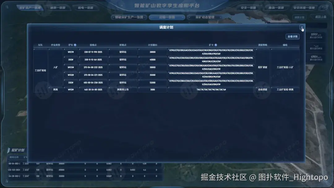依托图扑 HT 三维可视化技术,深度融合采剥生产、运输调度、资源储量等核心业务,一屏呈现采剥总量、设备工况、矿石品位等 20 余项关键指标,同步展示配矿计划执行进度与人员定位轨迹,实现矿山生产全流程动态监测与精细化管理。