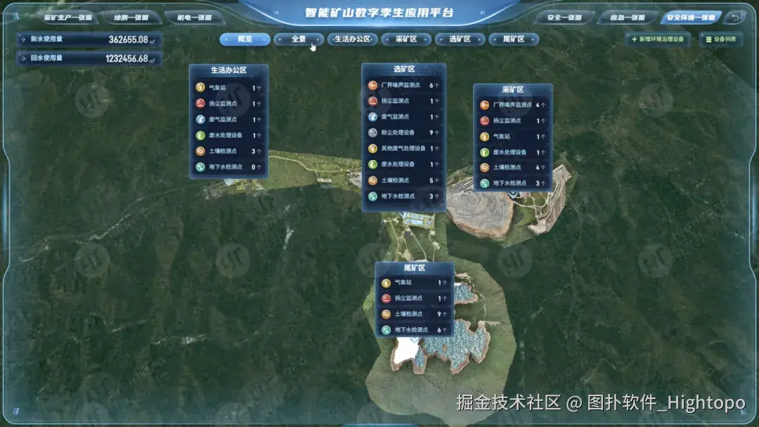安全环境一张图聚焦矿山环境安全监测与治理,通过一张图实时展示气象、厂界噪声、户外扬尘、废气排放及新水、回水使用量等关键环境数据。系统支持按区域定位环境监测与治理设备,在数字孪生模型中精准呈现设备安装位置,并可按需筛选不同类型设备。同时,可实时查看设备在线状态和监测数据,宏观汇总生活区、采矿区、选矿区及尾矿区的环境设备分布,并支持设备列表在线预览与定位功能,为矿山环境管控提供全面数据支撑,助力绿色矿山建设。
