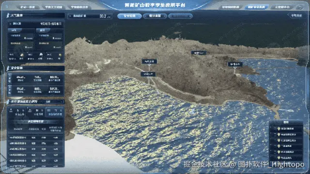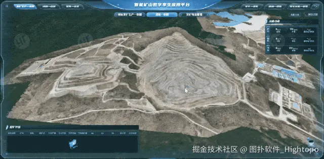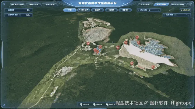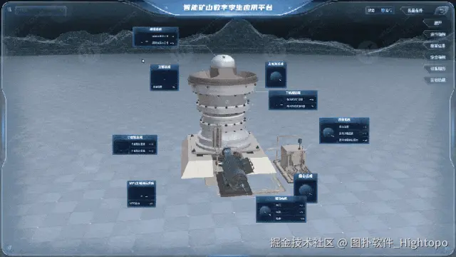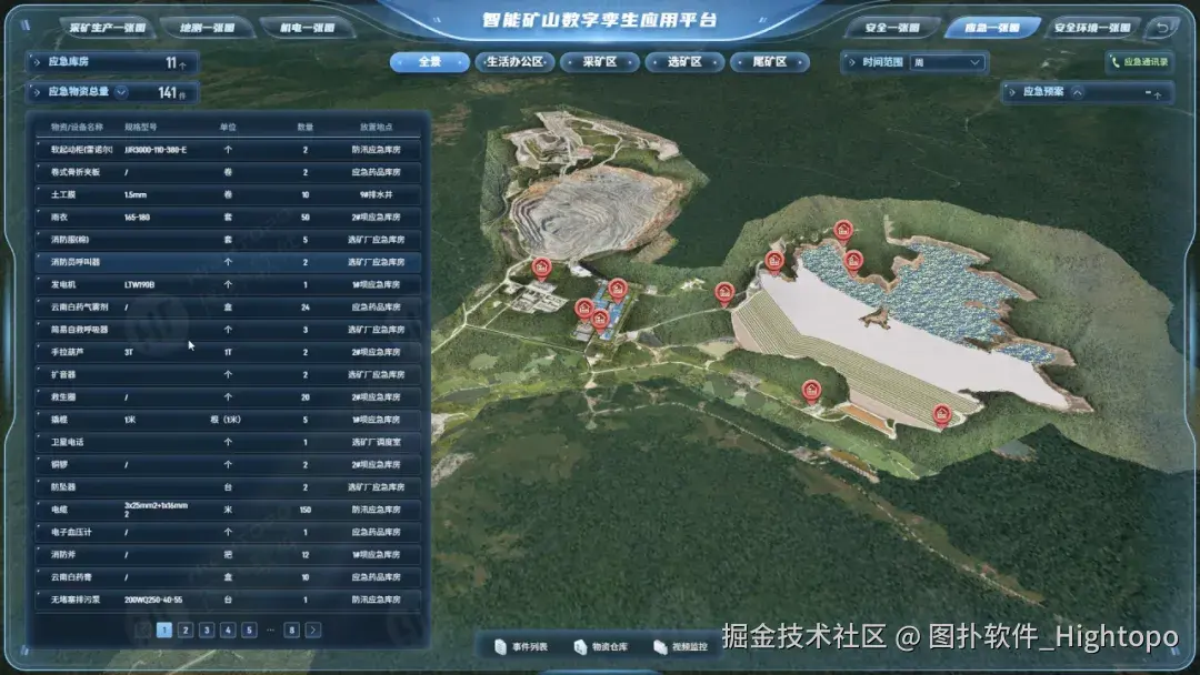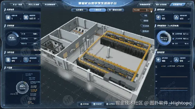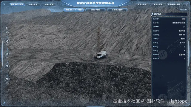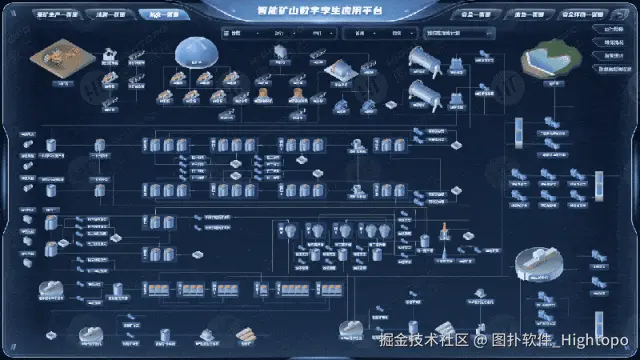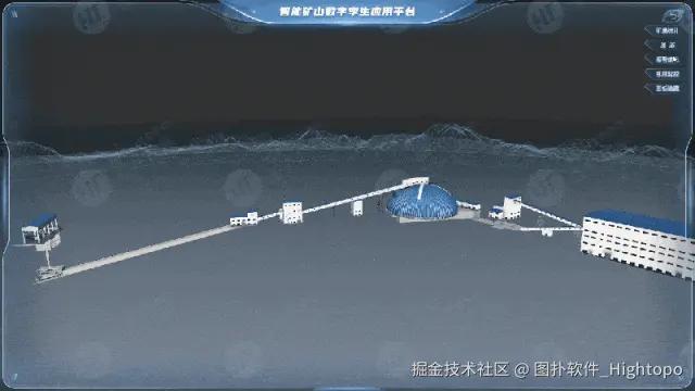 平台以图扑软件 HT 数字孪生技术为支撑,构建应用标准体系、管理系统、开发服务、数字资产建模、应用场景五大板块的完整架构,实现 20.8 平方公里矿区全要素毫米级数字化复现,覆盖矿区一张图、设备运维、工艺流程、尾矿安全、人员定位等全场景管控。依托多源数据整合与三维可视化技术优势,平台打通生产、安全、运维全业务链路,具备实时监测、智能预警、模拟推演、远程协同等关键能力,助力矿山实现“一矿一图、以图管矿”的智能管理模式,提质降本、筑牢安全环保防线。