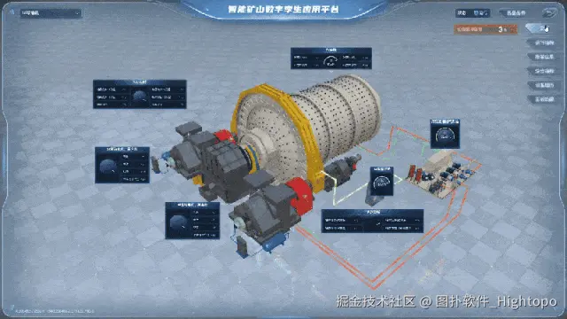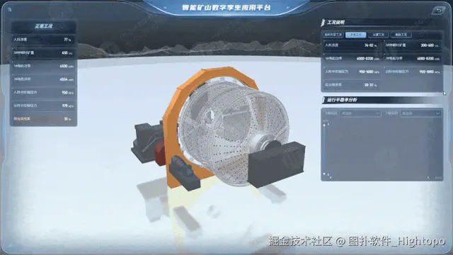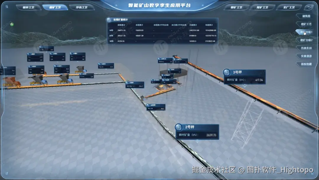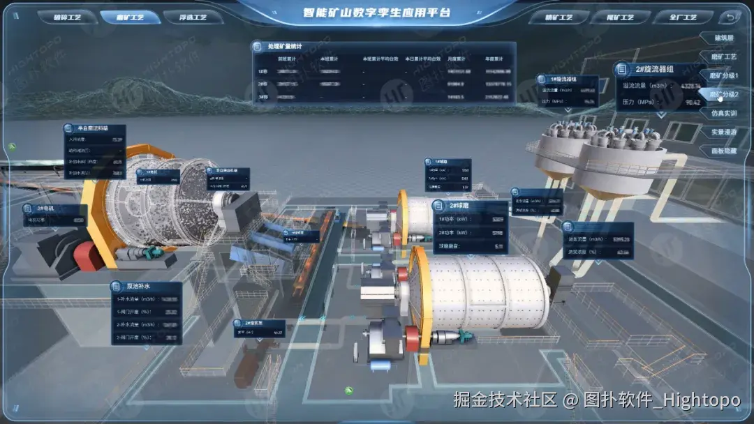 磨矿工艺承接破碎工艺后续作业,依托图扑 HT 数字孪生实现粗矿堆、半自磨、球磨、旋流器等全链路设备布局、物料流向的精准还原与实时管控。