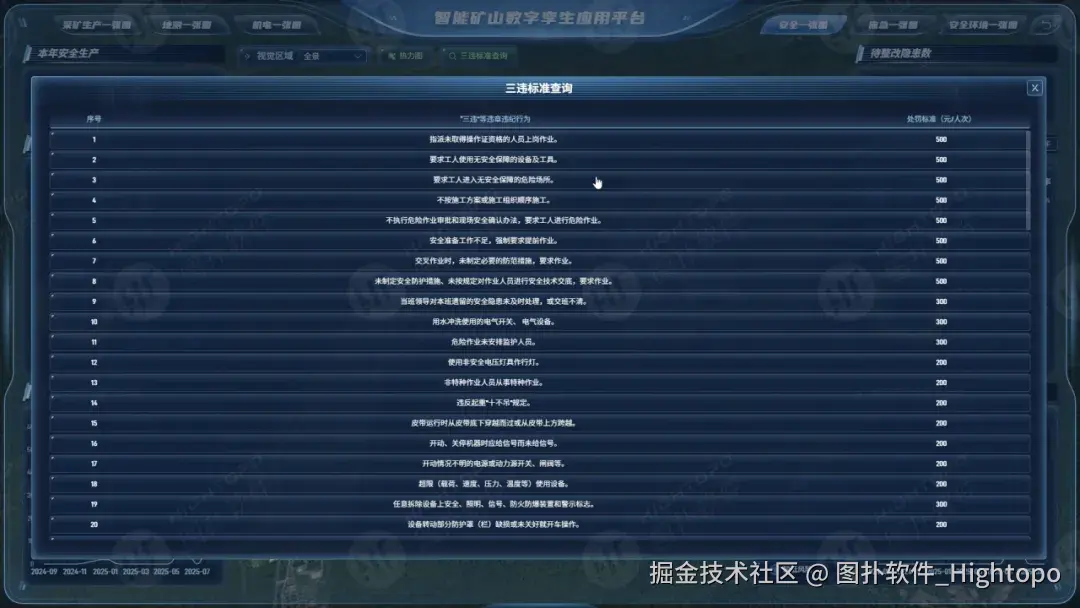 同时内置三违标准在线查询功能,涵盖违章违纪行为及对应处罚标准,为安全管理提供规范依据,让安全决策有数据支撑、管控有明确方向。