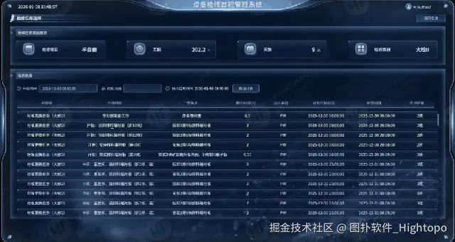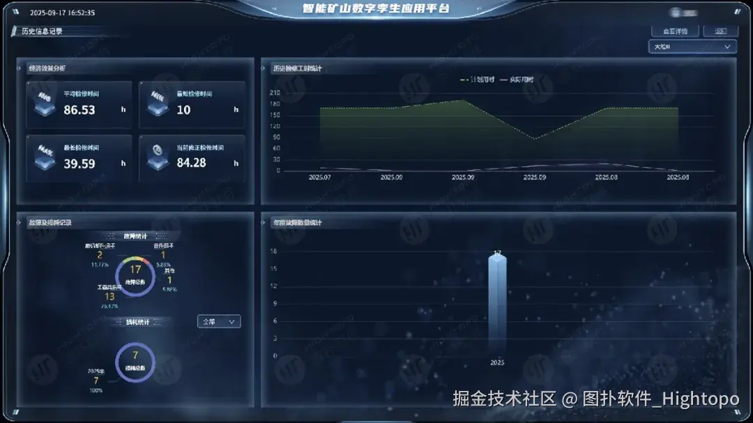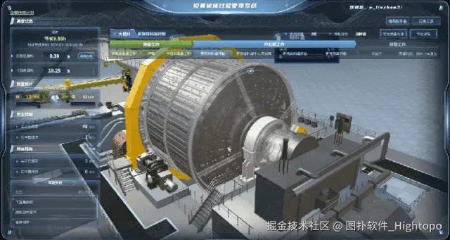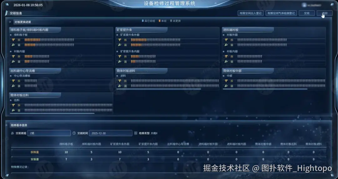 设备检修管理系统聚焦半自磨机、球磨机设备检修维保业务,构建全流程数字化管控体系。系统覆盖检修任务制定、排班调度、作业过程管控、安全质量巡查、进度管理及验收总结全流程,融入图扑 HT 三维动画工序仿真指导,实现检修进度全局把控、排程计划灵活调整。结合多维度评价体系复盘检修过程与作业效果,沉淀实战经验,持续驱动检修流程优化升级、缩短停机时间、降低运维成本。